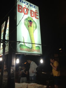 During the day we explored the fishing village on motorbikes, checked out the famous red sand dunes at sunset, then went out for dinner and drinks. Afterwards Evan was adamant that the three of us were going to drink cobra blood. I admit I was against it at first. I just didn’t see the point. We drove down the road until we saw this sign:
